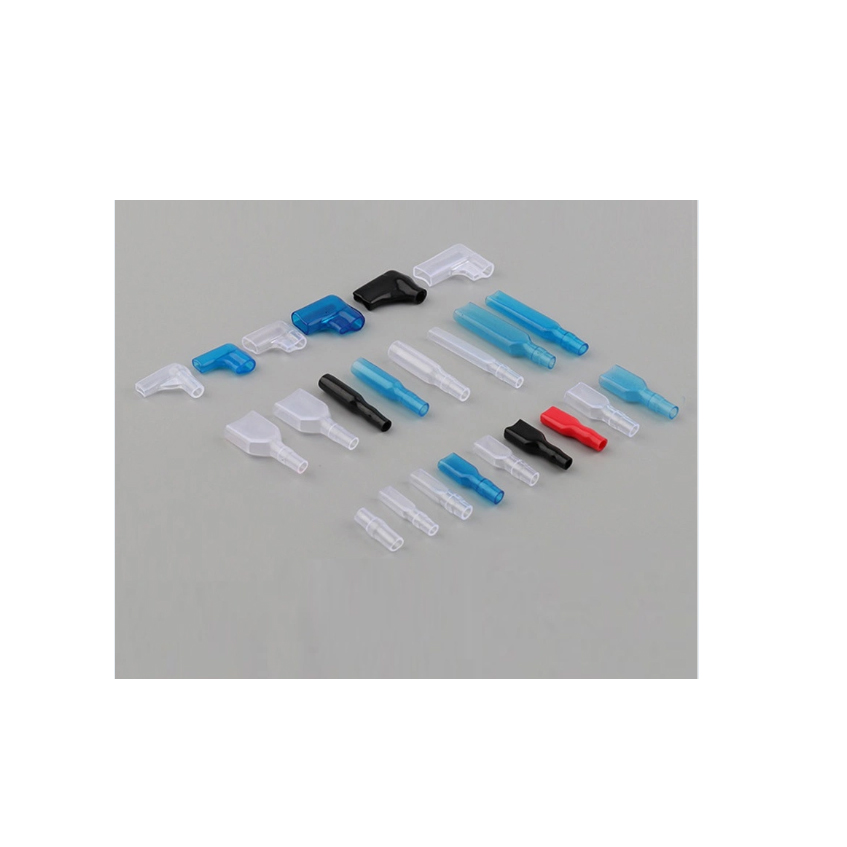 The spade crimp terminal connector has a flat, spade-shaped end that can be crimped onto the bare end of a wire. This allows for easy insertion and removal from a screw or stud terminal.To provide insulation and protect against potential electrical hazards, an insulating PVC sleeve is used. The PVC sleeve is placed over the crimped terminal to prevent contact with other wires or conductive materials.The insulating PVC sleeve is specifically designed to fit the F type spade crimp terminal connector, providing a secure and safe electrical connection.